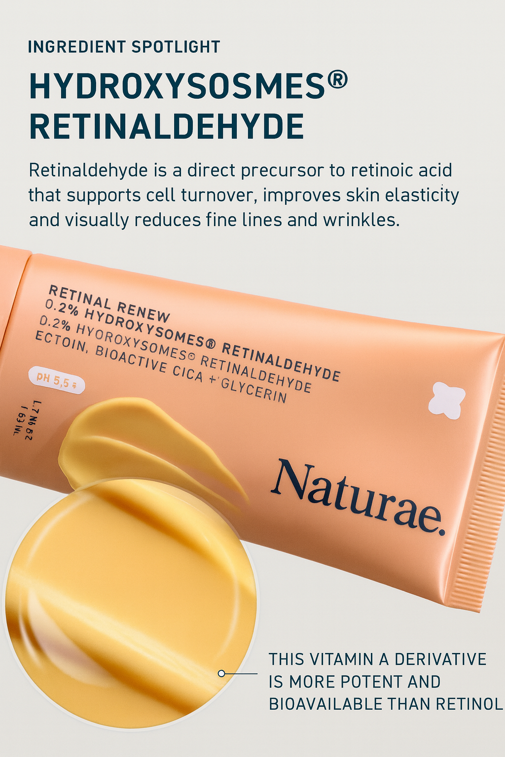 Retinal (retinaldehyde) is a more advanced form of vitamin A than retinol. While both work to support skin renewal and reduce the appearance of fine lines, retinal requires one fewer conversion step in the skin to become active. This means it works more efficiently and can deliver visible results faster than retinol.